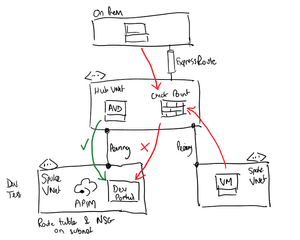 We have APIM deployed under the Developer Tier with Internal VNet integration. This will only be used for internal APIs across our Azure services and an ExpressRoute connected data centre. We have followed the guide for configuring APIM within the VNet including the NSG. APIM is in a healthy state however we have a connectivity challenge. The solution accelerator denotes a management jump box but other articles allude to connectivity subject to routes, NSGs, firewall config and DNS being in place. We have that in place, we're already able to connect to web services served in Azure from any on premises or Azure service that needs to negotiate our firewall. However APIM appears to have a little more complexity. Please excuse the quickly crafted crude diagram. Despite inbound rule additions for the APIM subnet NSG, connectivity to the Developer Portal isn't possible from any device that has to traverse the firewall. Whereas App Services in similarly configured subnets are accessible over port 443. An AVD VM in the hub VNet which uses system routes and bypasses the firewall connects without issue. We were wondering if anyone else has noted this issue and if there is a resolution without incorporating a jump box in that VNet or in a peered VNet?iainjo33Jan 09, 2023Copper Contributor739Views0likes0CommentsImplementing Routing Across HUBs in Azure