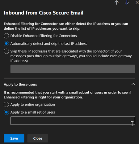One of my customer is using the Cisco Secure Email as their default gateway with a connector into M365. They would like to enable the enhanced filtering on the connector to improve their anti spam/malware protection. Enhanced Filtering on the “Inbound from Cisco Secure Email” connector: https://learn.microsoft.com/en-us/exchange/mail-flow-best-practices/use-connectors-to-configure-mail-flow/enhanced-filtering-for-connectors#use-the-microsoft-defender-portal-to-configure-enhanced-filtering-for-connectors-on-an-inbound-connector Do you know if there are any caveats adding a few mailboxes to the policy to test the behavior before they cutover the entire enterprise?77Views0likes0Comments