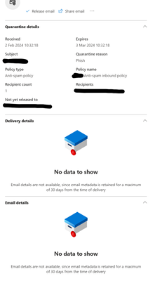 Hello, A customer has some users that have been assigned the Quarantine Administrator Role. When these people open a Quarantined message they see "No data to show" under "Delivery details" and "Email details", this started last Tuesday. As an admin with admin rights for this customer, I do see data here. I gave my user account Quarantine Administrator permissions and I can repro this issue.Solved1.4KViews0likes3CommentsEnroll