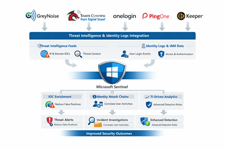 Microsoft Sentinel’s capability can be greatly enhanced by integrating third-party threat intelligence (TI) feeds (e.g. GreyNoise, Team Cymru) with identity and access logs (e.g. OneLogin, PingOne). This article provides a detailed dive into each connector, data types, and best practices for enrichment and false-positive reduction. We cover how GreyNoise (including PureSignal/Scout), Team Cymru, OneLogin IAM, PingOne, and Keeper integrate with Sentinel – including available connectors, ingested schemas, and configuration. We then outline technical patterns for building TI-based lookup pipelines, scoring, and suppression rules to filter benign noise (e.g. GreyNoise’s known scanners), and enrich alerts with context from identity logs. We map attack chains (credential stuffing, lateral movement, account takeover) to Sentinel data, and propose KQL analytics rules and playbooks with MITRE ATT&CK mappings (e.g. T1110: Brute Force, T1595: Active Scanning). The report also includes guidance on deployment (ARM/Bicep examples), performance considerations for high-volume TI ingestion, and comparison tables of connector features. A mermaid flowchart illustrates the data flow from TI and identity sources into Sentinel analytics. All recommendations are drawn from official documentation and industry sources. Threat Intel & Identity Connectors Overview GreyNoise (TI Feed): GreyNoise provides “internet background noise” intelligence on IPs seen scanning or probing the Internet. The Sentinel GreyNoise Threat Intelligence connector (Azure Marketplace) pulls data via GreyNoise’s API into Sentinel’s ThreatIntelligenceIndicator table. It uses a daily Azure Function to fetch indicators (IP addresses and metadata like classification, noise, last_seen) and injects them as STIX-format indicators (Network IPs with provider “GreyNoise”). This feed can then be queried in KQL. Authentication requires a GreyNoise API key and a Sentinel workspace app with Contributor rights. GreyNoise’s goal is to help “filter out known opportunistic traffic” so analysts can focus on real threats. Official docs describe deploying the content pack and workbook template. Ingested data: IP-based indicators (malicious vs. benign scans), classifications (noise, riot, etc.), organization names, last-seen dates. All fields from GreyNoise’s IP lookup (e.g. classification, last_seen) appear in ThreatIntelligenceIndicator.NetworkDestinationIP, IndicatorProvider="GreyNoise", and related fields. Query: ThreatIntelligenceIndicator | where IndicatorProvider == "GreyNoise" | summarize arg_max(TimeGenerated, *) by NetworkDestinationIP This yields the latest GreyNoise record per IP. Team Cymru Scout (TI Context): Team Cymru’s PureSignal™ Scout is a TI enrichment platform. The Team Cymru Scout connector (via Azure Marketplace) ingests contextual data (not raw logs) about IPs, domains, and account usage into Sentinel custom tables. It runs via an Azure Function that, given IP or domain inputs, populates tables like Cymru_Scout_IP_Data_* and Cymru_Scout_Domain_Data_CL. For example, an IP query yields multiple tables: Cymru_Scout_IP_Data_Foundation_CL, ..._OpenPorts_CL, ..._PDNS_CL, etc., containing open ports, passive DNS history, X.509 cert info, fingerprint data, etc. This feed requires a Team Cymru account (username/password) to access the Scout API. Data types: Structured TI metadata by IP/domain. No native ThreatIndicator insertion; instead, analysts query these tables to enrich events (e.g. join on SourceIP). The Sentintel TechCommunity notes that Scout “enriches alerts with real-time context on IPs, domains, and adversary infrastructure” and can help “reduce false positives”. OneLogin IAM (Identity Logs): The OneLogin IAM solution (Microsoft Sentinel content pack) ingests OneLogin platform events and user info via OneLogin’s REST API. Using the Codeless Connector Framework, it pulls from OneLogin’s Events API and Users API, storing data in custom tables OneLoginEventsV2_CL and OneLoginUsersV2_CL. Typical events include user sign-ins, MFA actions, app accesses, admin changes, etc. Prerequisites: create an OpenID Connect app in OneLogin (for client ID/secret) and register it in Azure (Global Admin). The connector queries hourly (or on schedule), within OneLogin’s rate limit of 5000 calls/hour. Data mapping: OneLoginEventsV2_CL (CL suffix indicates custom log) holds event records (time, user, IP, event type, result, etc.); OneLoginUsersV2_CL contains user account attributes. These can be joined or used in analytics. For example, a query might look for failed login events: OneLoginEventsV2_CL | where Event_type_s == "UserSessionStart" and Result_s == "Failed" (Actual field names depend on schema.) PingOne (Identity Logs): The PingOne Audit connector ingests audit activity from the PingOne Identity platform via its REST API. It creates the table PingOne_AuditActivitiesV2_CL. This includes administrator actions, user logins, console events, etc. You configure a PingOne API client (Client ID/Secret) and set up the Codeless Connector Framework. Logs are retrieved (with attention to PingOne’s license-based rate limits) and appended to the custom table. Analysts can query, for instance, PingOne_AuditActivitiesV2_CL for events like MFA failures or profile changes. Keeper (Password Vault Logs – optional): Keeper, a password management platform, can forward security events to Sentinel via Azure Monitor. As of latest docs, logs are sent to a custom log table (commonly KeeperLogs_CL) using Azure Data Collection Rules. In Keeper’s guide, you register an Azure AD app (“KeeperLogging”) and configure Azure Monitor data collection; then in the Keeper Admin Console you specify the DCR endpoint. Keeper events (e.g. user logins, vault actions, admin changes) are ingested into the table named (e.g.) Custom-KeeperLogs_CL. Authentication uses the app’s client ID/secret and a monitor endpoint URL. This is a bulk ingest