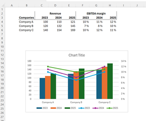 Hi all, I want a chart showing the development in revenue and margins over a period of three yrs. I want the revenue to be marked on the left hand x axis and margins to be marked on the right hand x axis (secondary axis). I can't quite get it to look the way I want. See the attached picture. What I want is for the margins (currently shown as lines across the three companies) to show as lines across each company over the time period. So basically one line across company A, one line across company B and one line across company C. Appreciate any help! Best regards, KrisKris1Jan 10, 2026Copper Contributor53Views0likes1CommentHow to create a multi-tiered percentage-based bar chart?