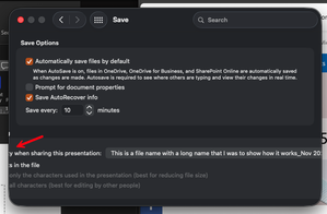 New Outlook for Mac has since some versions back gotten the feature where the user can upload a file and share it to the recipients of the e-mail. The file will be per default be uploaded to DOWNLOAD folder in OneDrive. Now this is not working on Outlook for Mac as the whole access permission Recipients of this message" is missing. On Windows and Outlook on Web, this is available, but not for New Outlook for Mac. It seems that this feature is not yet fully developed on Outlook for Mac. Any others that see the same and can confirm?Yassin KoleilatNov 20, 2025Brass Contributor56Views1like2CommentsPowerPoint for Mac - Embed font settings in broken if long file name
