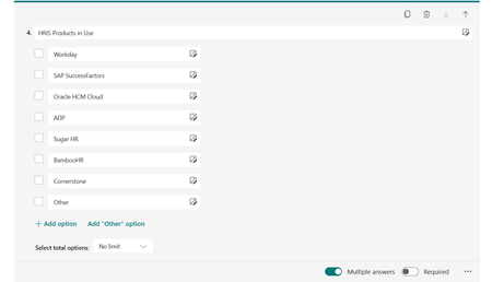 HELLO, I am working on a form. Question type is choice where user can select "Multiple Answers" and based on selected answer, subsequent question should be visible. To achieve this, i want to add branching to main question but i do not see the option to do so. How to achieve this ? NO branching option :ApoorvaTipre21Oct 28, 2025Copper Contributor163Views1like1Comment