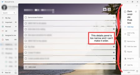 The details panel in Microsoft To Do is too narrow and I can't make it wider