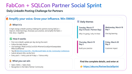 A 4‑Day LinkedIn Challenge for Partners Attending FabCon + SQLCon in Atlanta If you’re joining us in Atlanta this March for FabCon + SQLCon 2026, we’ve got a new way for you to amplify your impact: the Partner Social Sprint — a daily LinkedIn challenge designed to spotlight partner voices, share real‑world insights, and have some fun along the way. Whether you’re presenting, staffing a booth, or attending sessions, this is your chance to tell your story and connect with the global Microsoft Fabric & SQL community. 🔥 What Is the Partner Social Sprint? A 4‑day LinkedIn posting challenge running during FabCon + SQLCon 2026 in Atlanta. Each day has a theme, and every post earns you entries to win exclusive Fabric SWAG, including the fan‑favorite Fabric Kicks. 🗓 Daily Themes (Conference Week) Tuesday, March 17 – Day 0 (Travel / Partner Day) Why I’m going / why I’m here Wednesday, March 18 – Day 1 One big learning Thursday, March 19 – Day 2 Build your practice Friday, March 20 – Day 3 Customer impact ✅ How It Works If you’re a partner attending FabCon + SQLCon in Atlanta: Post once per day on LinkedIn during the event, following the daily theme. Use the hashtags: #FabConSQLCon2026 #PartnerSocialSprintSweepstakes #MicrosoftPartner Tag the FabCon & SQLCon – The Microsoft Fabric & SQL Community Conferences LinkedIn page. Submit all your LinkedIn post URLs via the entry form. 👉 Each post = 1 entry, and if you post all 4 days, you’ll get 1 bonus entry. 🏆 What You Can Win Fabric SWAG Fabric Kicks Recognition in the Fabric Partner Community and across our channels 🌐 Who Should Join? Microsoft partners attending FabCon + SQLCon in Atlanta Partner sellers, architects, engineers, and community champions who want to: Share key learnings in real time Highlight their Fabric & SQL practices Showcase customer success and impact 👉 Ready to Sprint With Us? Get all the details and submit your posts here: https://aka.ms/PartnerSocialSprint Let’s light up LinkedIn with the stories, insights, and innovation coming out of FabCon + SQLCon. We can’t wait to see your posts from Atlanta!Registration Status