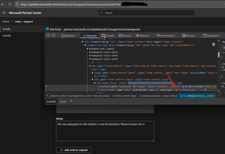 When updating a partner center support ticket from the Partner Center (https://partner.microsoft.com/dashboard/v2/support/servicerequests) However, the textbox for adding a new note from the portal has a max length of 80 characters. Has anyone else noticed this? I shared this observation with the partner center support team a while ago and learned that the portal is working as intended. The web portal should only be used for adding short notes. For longer notes, partners should update the ticket via email. I hoped my feedback might reach someone that could make this improvement to the partner experience, but it's taking longer than expected. Has anyone else noticed this issue, or am I the only partner that finds this behavior less than ideal? On more than one occasion I have modified the HTML using the browser dev tools by changing the maxlength="80" to "maxlength="800" and didn't have any trouble adding the longer note. Has anyone else run into this challenge and used the a workaround like the one I used?Hardware workspace "account deactivated" - cannot submit driver for attestation signing