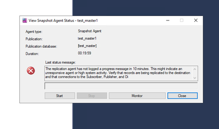 Hi, I am trying to setup replication of MSSQL database hosted on Windows (Master) to database hosted on Ubuntu (Slave). After configuring the Publisher agent on Master, when I try to run agent to generate snapshot and check status, it shows "Starting agent". It keeps on running endlessly even though the size of my test database is very small. I have checked that master server is not having any heavy processes running on it. Has anyone faced similar issue as well and resolved it then please guide. Thanks & Regards. Aditya.AdityaGaurSep 22, 2024Copper Contributor319Views0likes1Comment