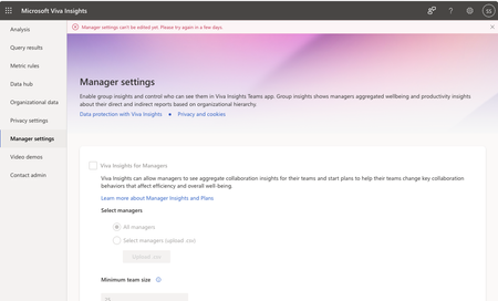 Hi Experts, who knows this error message when setting up the manager function and can help? The message appears since 4 days. Manager settings can't be edited yet. Please try again in a few days. I have already set roles, assigned licenses, and uploaded organization profiles. Thanks,Satossy0206Jun 19, 2023Microsoft977Views0likes6CommentsOrganization analytics licensing needs