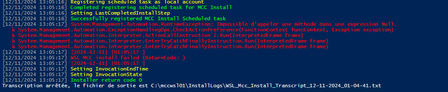 I installed a couple of MCC for customers. But for 1, I still get this error : This is the end of my text file : Restarting WSL to apply new configuration file, please wait while WSL is restarted...... [12/11/2024 13:05:01] . . . . . . . . . . . . . . . [12/11/2024 13:05:15] Completed WSL restart [12/11/2024 13:05:15] Completed restart and successfully applied new configuration file [12/11/2024 13:05:15] Setting LastCompletedInstallStep [12/11/2024 13:05:15] Registering the MCC Monitoring scheduled task [12/11/2024 13:05:15] Register scheduled task MCC_Monitor_Task (mccscheduletask.ps1) [12/11/2024 13:05:15] Registering scheduled task as local account [12/11/2024 13:05:16] Completed registering scheduled task for MCC monitoring [12/11/2024 13:05:16] Completed registering task to monitor MCC and ensure it is running [12/11/2024 13:05:16] Registering the MCC Uninstall scheduled task [12/11/2024 13:05:16] RegisterScheduledTask_UninstallWsl (uninstallwsl.ps1) [12/11/2024 13:05:16] Registering scheduled task as local account [12/11/2024 13:05:16] Completed registering scheduled task for MCC uninstall [12/11/2024 13:05:16] Completed registering task to uninstall MCC manually, if needed in the future [12/11/2024 13:05:16] Setting LastCompletedInstallStep [12/11/2024 13:05:16] Registering MCC install task and waiting for compleition [12/11/2024 13:05:16] RegisterScheduledTask_InstallMccOnWsl (InstallMccOnWsl.ps1) [12/11/2024 13:05:16] Registering scheduled task as local account [12/11/2024 13:05:16] Completed registering scheduled task for MCC Install [12/11/2024 13:05:16] Setting LastCompletedInstallStep [12/11/2024 13:05:16] Successfully registered MCC Install Scheduled task [12/11/2024 13:05:17] System.Management.Automation.RuntimeException: Impossible d’appeler une méthode dans une expression Null. à System.Management.Automation.ExceptionHandlingOps.CheckActionPreference(FunctionContext funcContext, Exception exception) à System.Management.Automation.Interpreter.ActionCallInstruction`2.Run(InterpretedFrame frame) à System.Management.Automation.Interpreter.EnterTryCatchFinallyInstruction.Run(InterpretedFrame frame) à System.Management.Automation.Interpreter.EnterTryCatchFinallyInstruction.Run(InterpretedFrame frame) [12/11/2024 13:05:17] [2024-12-11] [01:05:17 ] [12/11/2024 13:05:17] WSL MCC install failed (ReturnCode: ) [12/11/2024 13:05:17] [2024-12-11] [01:05:17 ] PS>Erreur de terminaison (SetDWordRegistryValue) : « Impossible de lier l'argument au paramètre « Value », car il s'agit d'une chaîne vide. » [12/11/2024 13:05:17] Setting InvocationEndTime [12/11/2024 13:05:17] Setting InvocationState [12/11/2024 13:05:17] Installer return code 0 ********************** Fin de la transcription Windows PowerShell Heure de fin : 20241211130517 **********************SolvedNicoSthilaireDec 11, 2024Copper Contributor491Views0likes4CommentsTrying to install to Windows Server + WSL error