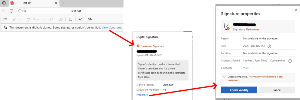 Since the last edge update we are running into the following issue, which triggers support tickets on our side. It seems that the edge internal PDF Reader now supports validation of digital PDF signatures. This new feature however is incomplete and causes a lot of confusion for edge users. "Official" signatures are labeled as "Unknown Signature" and "The validity of the signature is still unknown":