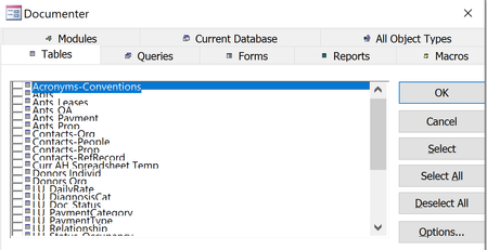 In MS Access Office 365, the Database Tools tab, the Database Documenter dialog choices are overlapping and are unreadable therefore uncheckable. Tried different resolutions and magnification for dis...