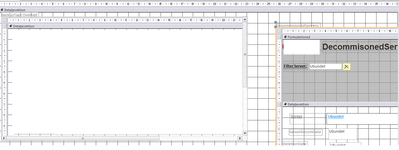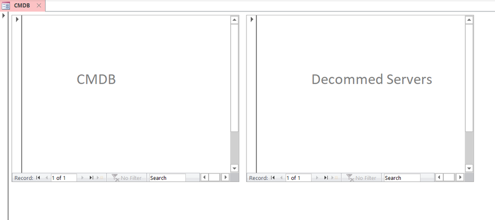 You can do this with subforms. First, create (sub)forms for CMDB and Decommed Servers. I called them SubCMDB and SubDecommedservers. Next, create a blank form and add the subforms to the blank main form through the Design-tab with this control: