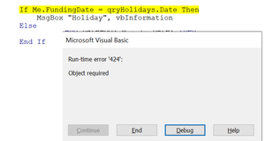 Hello Experts, I need a msgbox to appear if the date I enter [FundingDate] equals any of the values in qryHolidays.Date. I get an Object Required error. I am not sure where the error is? t...