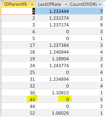 WHERE T1.IDRollsPK=(SELECT Max(IDRollsPK) FROM tblFXRollsChild WHERE Rate<>0 AND IDParentfk=T1.IDParentfk)