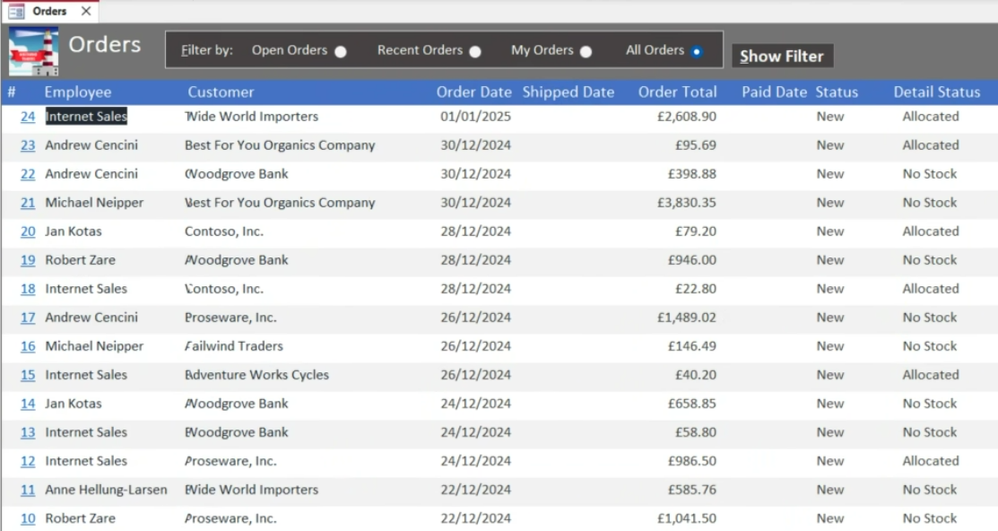 We can easily reproduce on other machines and monitors, e.g. this is from a colleague on a different monitor Dell P2422H 1920 x 1080 with scaling 125% (not recommended setting) after page down/up - note the second column corruption plus showing wrong data for the ID 24 (not World Wide Importers!). Again problems are worse the larger the form (e.g. maximised is really bad). On her other monitor (same model) at 100% scaling, there are similar problems though slightly less pronounced - it takes a couple of page down/up before the display starts to break down. On her primary laptop monitor no problems at all (resolution 1920 x 1200, scaling 125%).