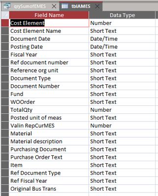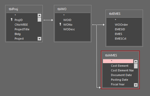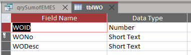 FROM ((tblProj LEFT JOIN tblWO ON tblProj.ProjID = tblWO.WOID) LEFT JOIN tblEMES ON tblWO.WONo = tblEMES.WOOrder) LEFT JOIN tblAMES ON tblWO.WONo = tblAMES.WOOrder;For each table below, the WONo and WOOrder fields are Short text - Field Size 10
