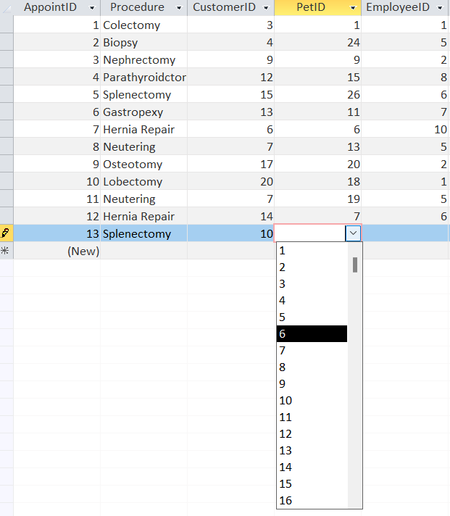 Seanarm1234 There is no need to store the customerID in the appointment table. If you just store the petID, you can find the customer through the pet table. You can show the customer on the appointment form and use that to find a pet for a new appointment. Search for "cascading comboboxes" to find examples.