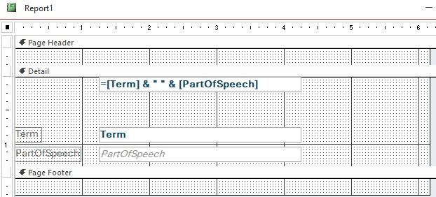 The "Term" text box was clearly BLUE and BOLD, and the "PartOfSpeech" text box was clearly grey and italicized. When the two text boxes were concatenated, the second text box lost its formatting (this can be seen in the last image, which is Print Preview mode).