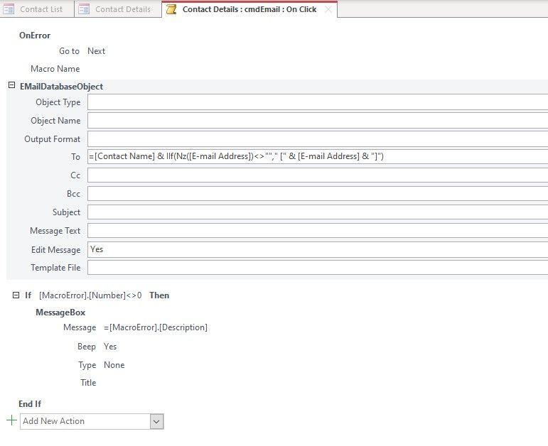 - rellimMACopper ContributorThank you for providing the link! I'll dig into that ASAP. In researching the "EmailDatabaseObject" macro script previous to employing it, I did learn that the default blank "Object Type, Object Name and Output Format" fields is supposed to yield an email with no attached object (table, query, form, etc.). Both PCs are MS 365-based and use Outlook. It remains a conundrum why this isn't behaving the same on both PCs? Thanks again for your responses.