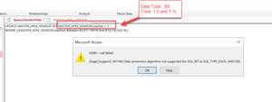 ODBC --call failed. [Sage][Support] (40190) Data conversion algorithm not supported for SQL_BIT to SQL_TYPE_DATE. (#40190) I'm trying to execute an update statement in MS Access using the followi...