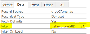 Yes, I did try that thinking the same thing but it does not filter back to the initial filter (ie LetterOfCreditID = 21 even though the form says it is filtered to LetterOfCreditID = 21 as shown in the form's data tab filter field (the first pic above).