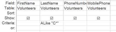 WHERE (((Volunteers.LastName) Like "C*"));When I select the run feature, it comes back as ALike "C*"