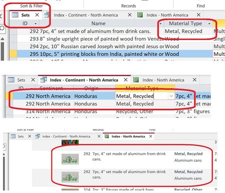 SELECT DISTINCT Material.[Material Type], Sets.[Material Type], Sets.[Material Description], Origin.Continent, Sets.Origin, Origin.Country, Sets.ID, Sets.Name, Sets.[Acquired Year], Sets.[Number of Pieces], Sets.[Height of Tallest Piece (Inches)], Sets.[Material Type].Value, Sets.[Manufacturer/Artist], Sets.[Photo 1]