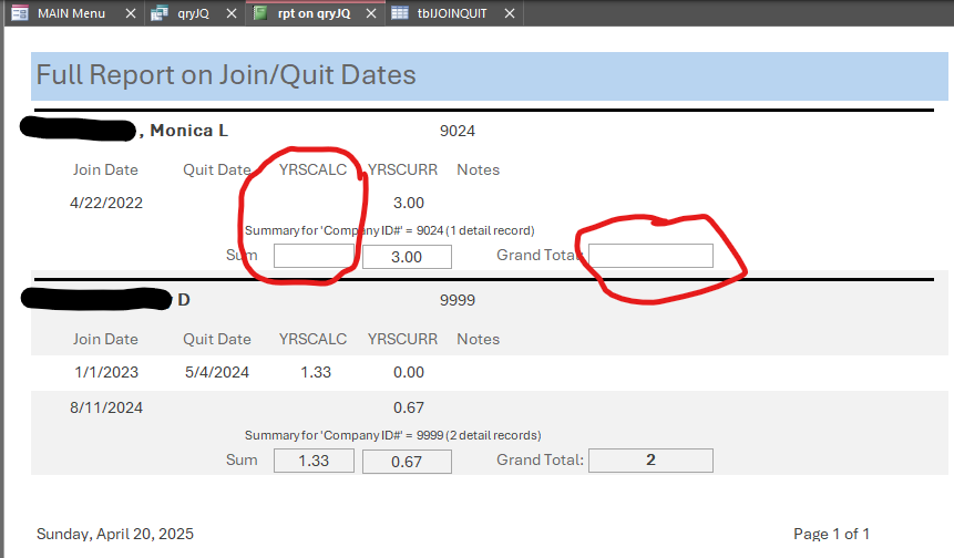 I made a select query, with 2 IIF statements, and 2 conversions. My Datasheet view shows correctly, but when i put the fields on a report, YRSCALC is empty, and doesn't sum, which affects Grand Total. I have tried every type of formatting i can think of..