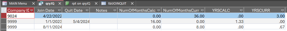 I have a Table that has 4 field (plus key), Company ID, Join Date, Quit Date, Notes. This tracks agency membership