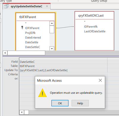 Ok that makes sense. qryFXSettDtCLast is an aggregate query. Do you happen to know of a workaround? I definitely need to update tblFXParent.DateSettleC to the LAST of Date Settle as found in [qryFXSettDtCLast]