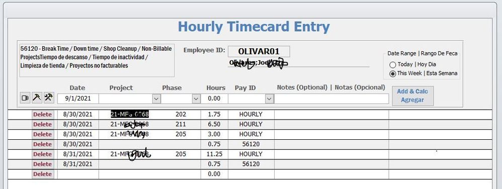 Employees enter their time into a split Access database application, in which the front-end is located on each PC. User opens the entry form that is bound to a linked table -tblHours, that is filtered for that employee and the day They select a project and type their hours into unbound text boxes at the header, the [Add Hours] button adds the new entry then calls the private sub CalculateHours , which updates the tblHours again, through a recordset, which is filtered for that employee and the current week, result is less than 100 records.