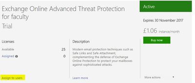 Can someone explain where I go from here? This suggest that I could purchase a single ATP license and then apply policies for all my users? What do the 25 licenses in the trial refer to, and how to I assign them to users? There is even a link in the subscription information to 'Assign to users', but that just takes you to the process I've already tried.