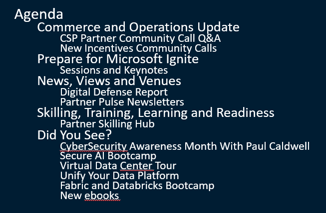 As you can see the focus is Prepare for Microsoft Ignite and let me warn you ... the "Did You See?" segment is big. There's been plenty of learning and skilling since we last met and I'll do my best to summarize and offer links to records so as to save you time and focus on the most relevant to you and your team.