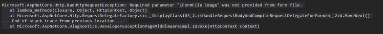 Microsoft.AspNetCore.Http.BadHttpRequestException: Required parameter "IFormFile image" was not provided from form file.