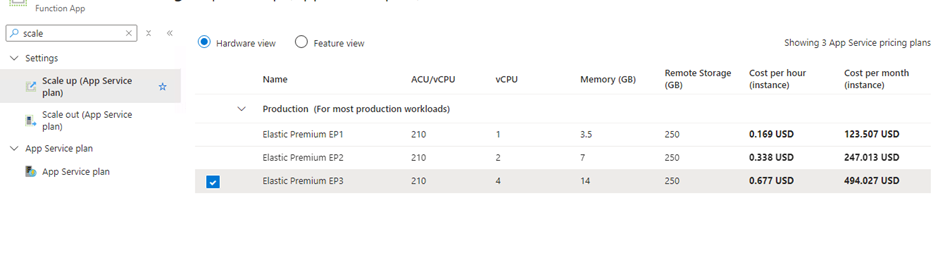 Choose a pricing plan that aligns best with your workload. For instance, the Premium plan offers features such as better scaling, VNET integration, and always-on capabilities.