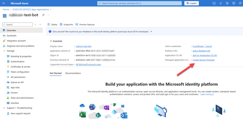 - Service Principal Creation Anomaly: The Enterprise Application (Service Principal) for my bot's App Registration was NOT automatically generated; I had to create it using a link on the app registration page (see screenshot below).