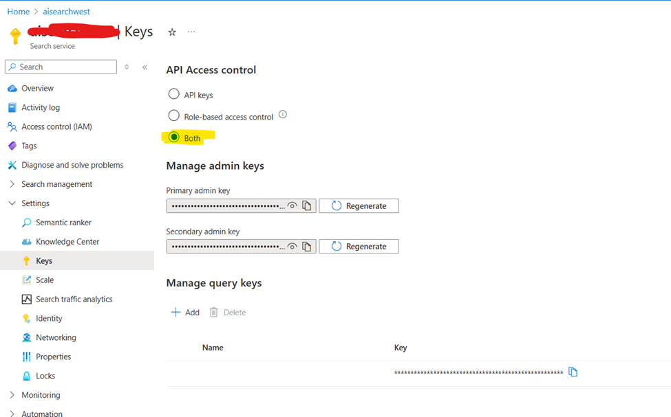 Step 4 – The AI Search resource needs to allow “Role-based access control” or “Both”
