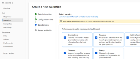 i am able to test my deployment in playground with my own data but now when trying to evaluate model metrics getting this error "Azure OpenAI Deployments: Failed to fetch Azure OpenAI deployments for...