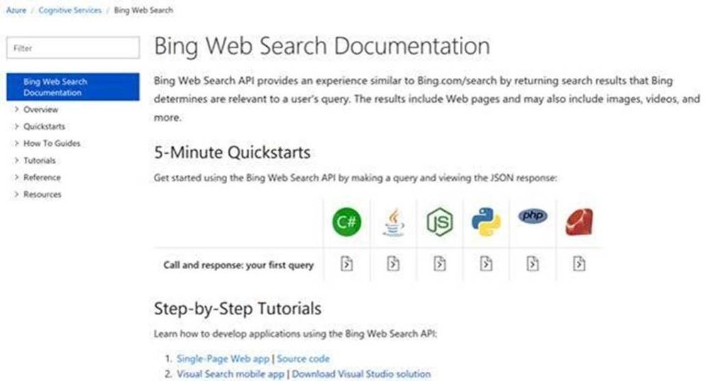 Quickstarts and tutorials are available in the “Documentation” section of the corresponding Bing API.