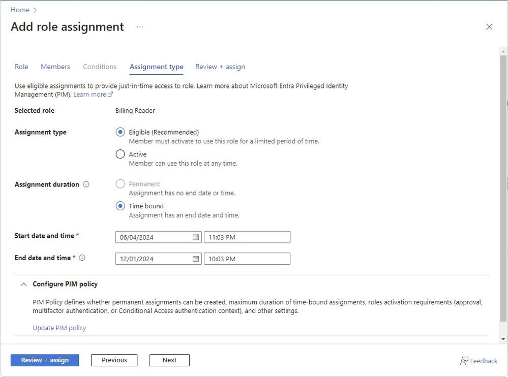 $groupId = $groupObject.Id# Assign the role with eligible and time-bound settings