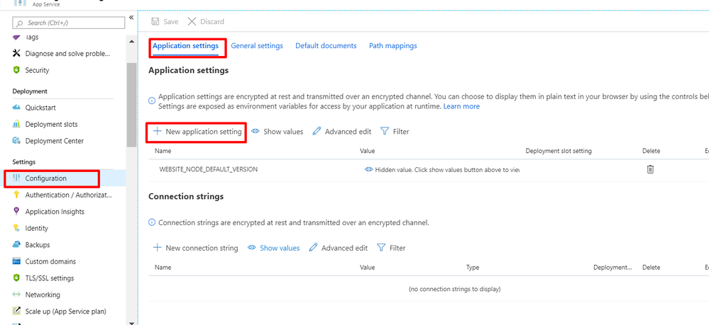 I'm having an issue reading env variables on Azure App Service Windows instance. I use dotenv nodejs package for storing my env variables in .env file. It works perfectly fine on my local machine (Windows 10), but the same does not when hosted on a Windows App service. I tried some troubleshooting by printing out the env variables at run time and I get blank output for the same. Somehow it's not able to read the variables in the .env file.