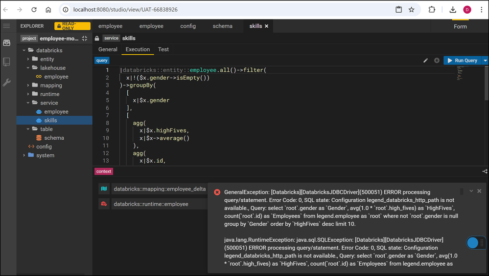However, when I run a SQL query from Legend Studio, which is supposed to execute on Databricks, I get a "Configuration legend_databricks_http_path is not available" error from Databricks: