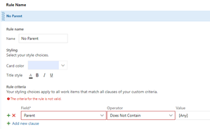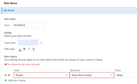 We аre trying to implement items on a board in Azure DevOps which are colored in case they have no "Parent" associated with them. Currently, we are struggling with the correct value clause here. W...
