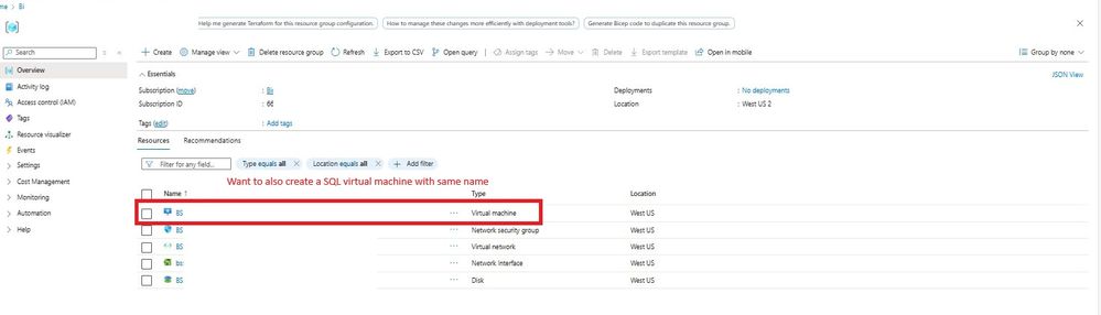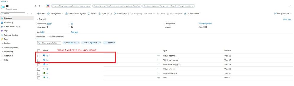 Currently we have a resource group, which contains a Virtual Machine and SQL Virtual Machine (and a few other resources). The VM and SQL VM has the same name: