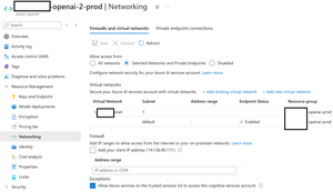 - Verify that the firewall rules for the OpenAI resource in tenant B allow traffic from the peered virtual network in tenant A. You may need to add the IP address range of the peered network to the allowed list.