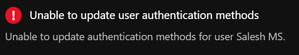 While i am trying to update the user mobile and alternative Email id in Azure authentication methods i am getting " Unable to update user authentication methods" error. Please can any one help me on ...