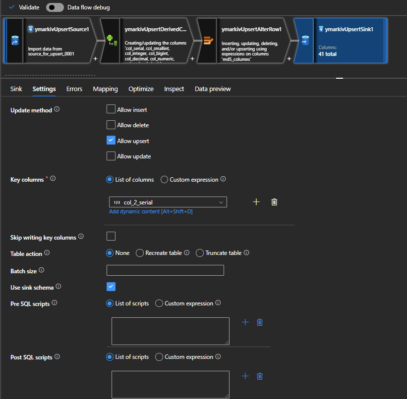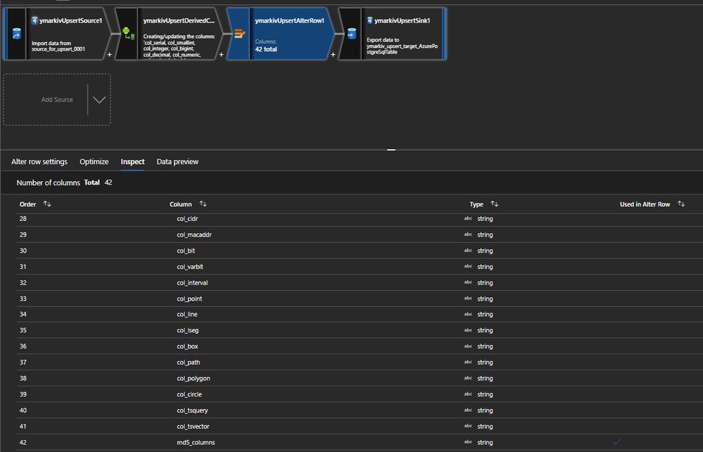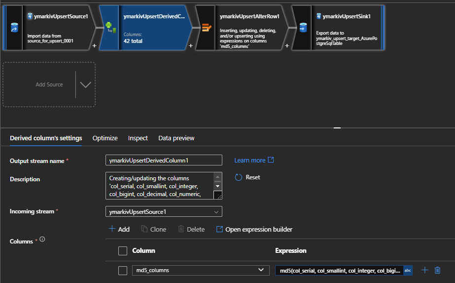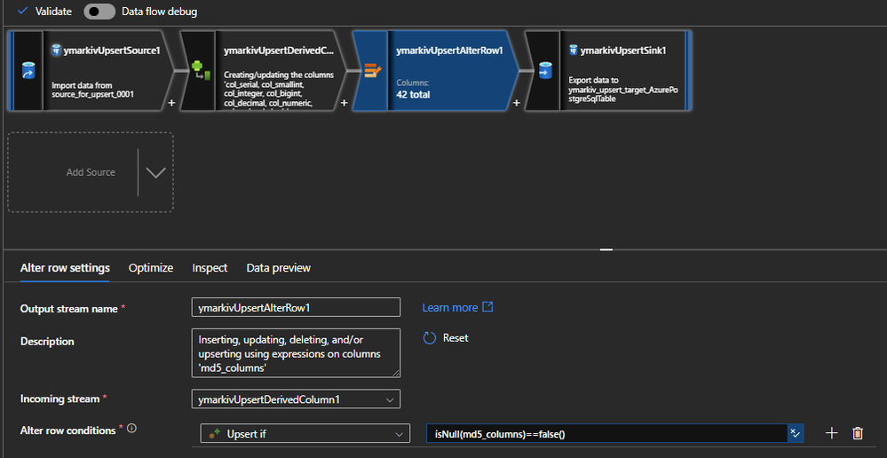 Upsert Alter Row - Upsert if: isNull(md5_columns)==false()