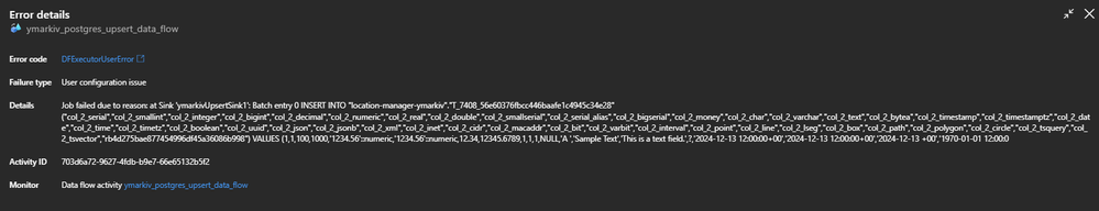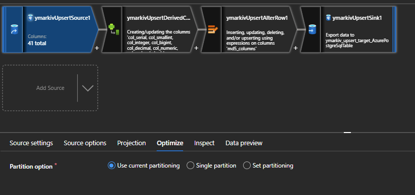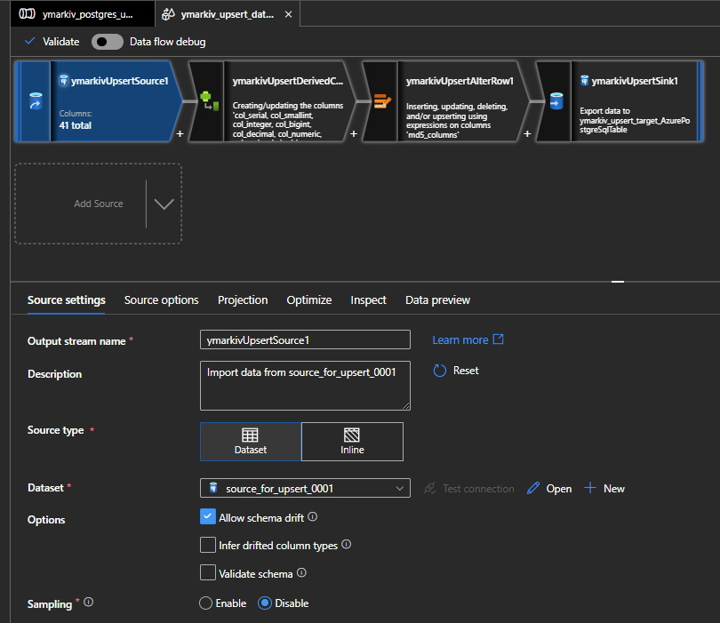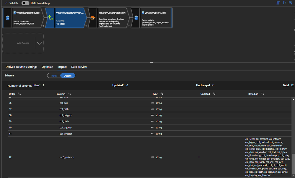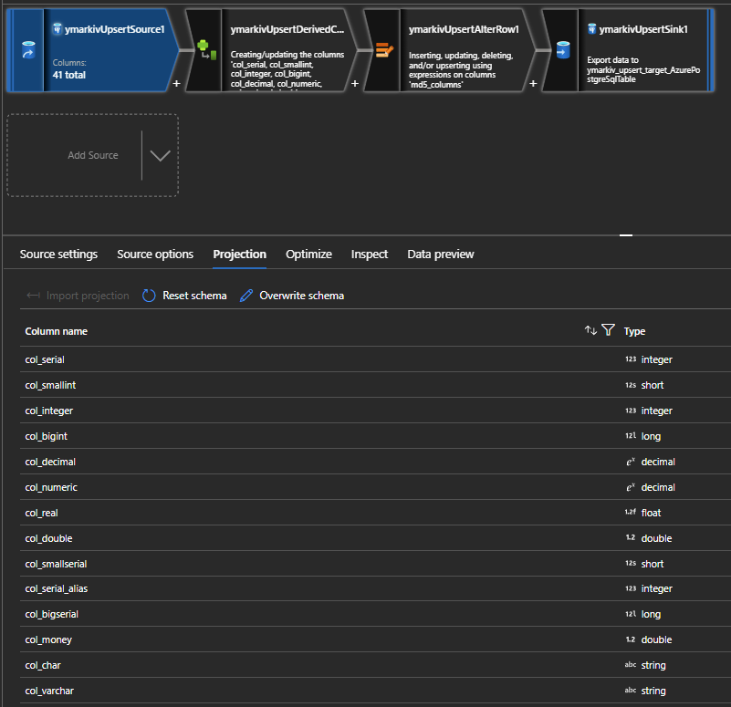 I'm trying to create sample Upsert data pipeline in ADF (insert missing records and update changed ones). I created sample source and target Postgres table with all data types available, the number of source and target columns slightly differ.