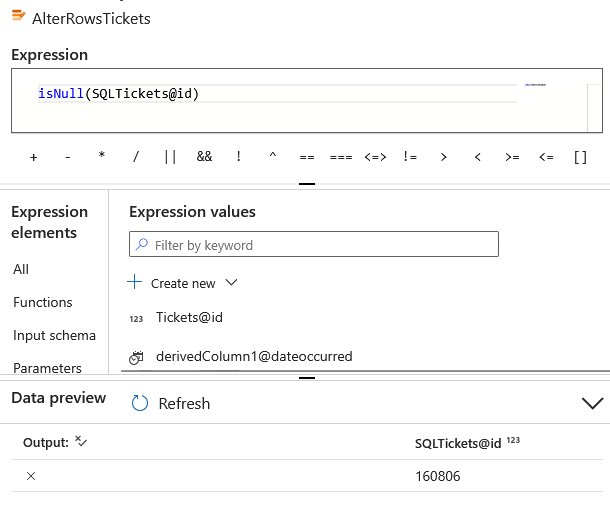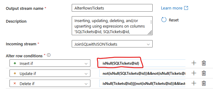 It should insert only if the SQLTickets id column is null, but here in the data preview from the same Alter rows action. It's marked as an insert, despite the id column from both sources clearly having a value: