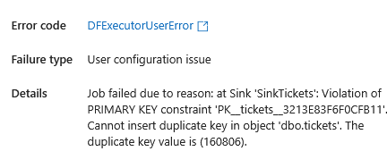 The problem I'm having is I get a primary key violation error when running the Dataflow as it's trying to insert rows that already exist: For example in my run history (160806 is the minimum value for ID in the SQL database):